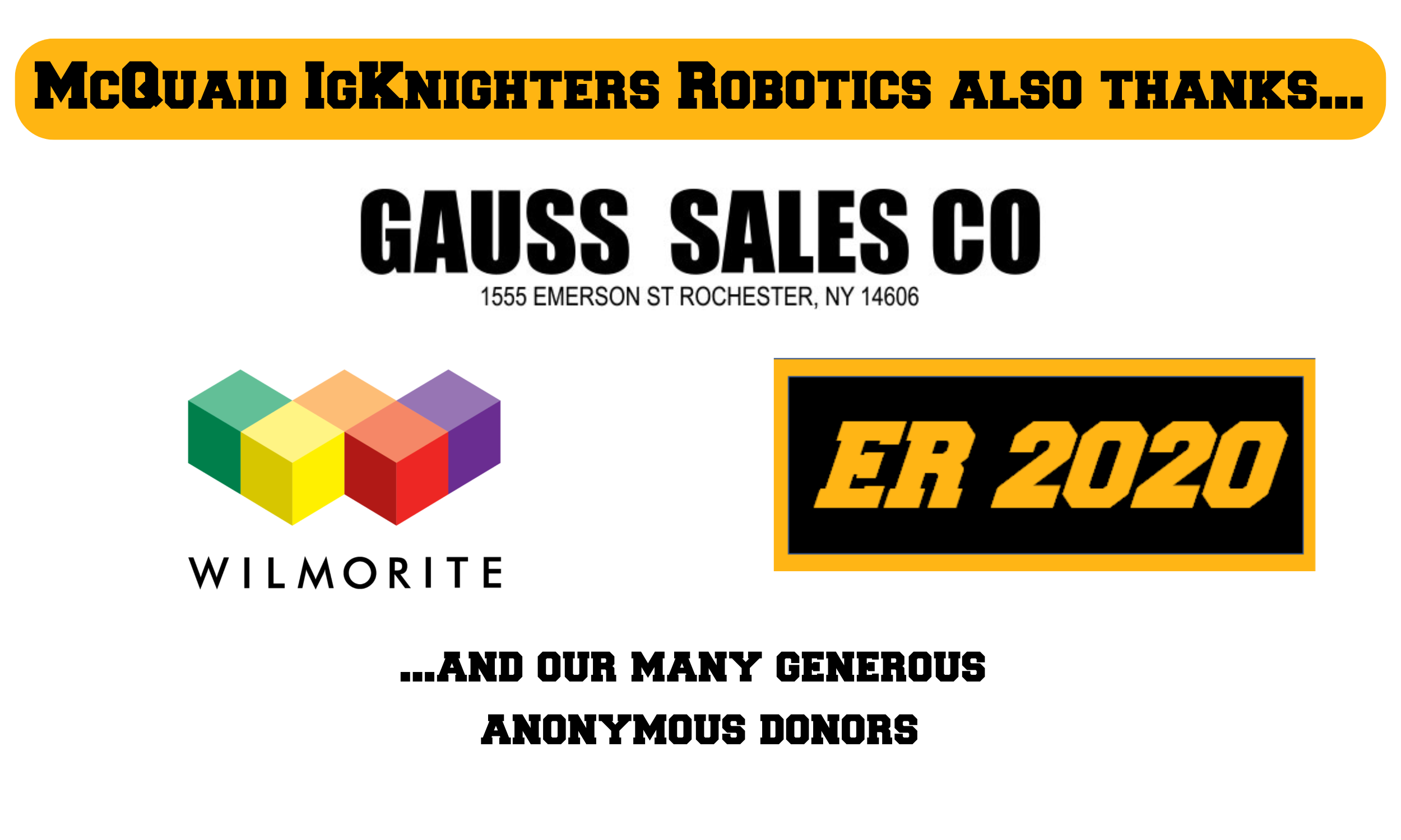 The McQuaid IgKnighters Robotics Team would not be possible without the generous support of our sponsors. Corporate sponsorship and individual donations provide the team with the financial resources necessary to participate in high-level design, engineering, programming, and manufacturing processes utilizing tools that are actively being used in industry today. The exposure to iterative engineering design principles, problem based learning, and tight deadlines provides our team-members with up to 4 years of invaluable experience and knowledge as they go on to pursue a career in STEM after high school.