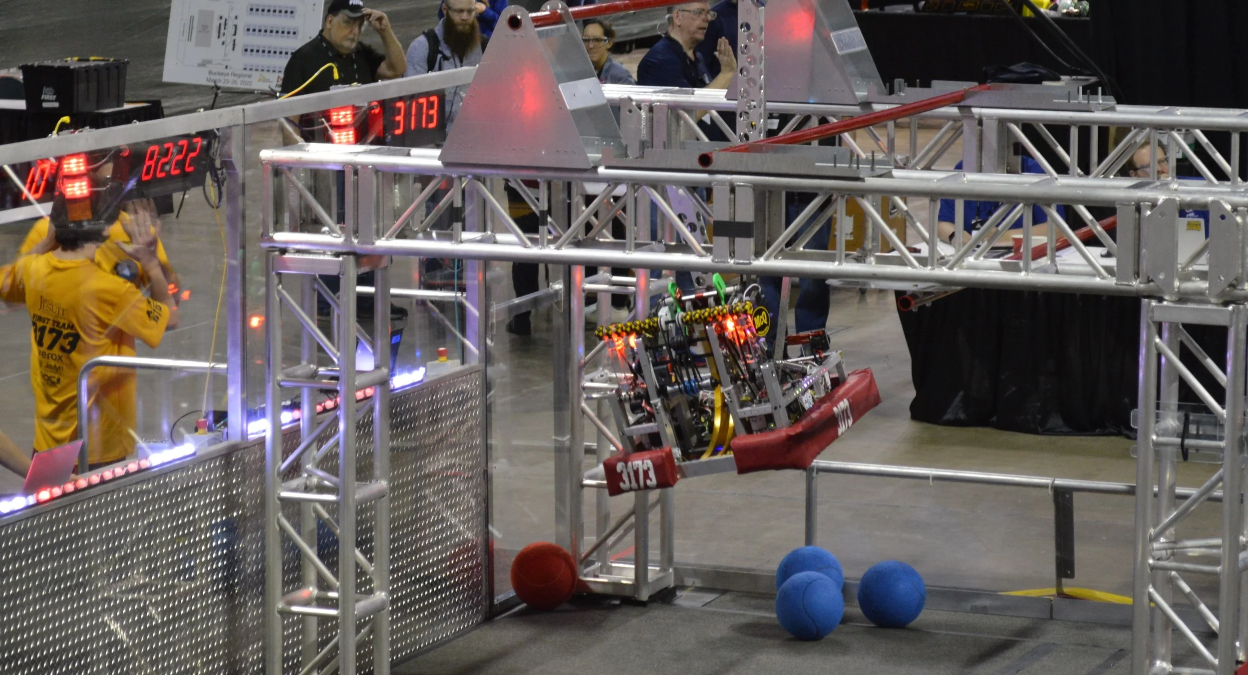 A swerve-drive, aluminum frame, 85 pound speedster with an articulated arm and pincers designed for grabbing small rubber traffic cones and inflated cubes, the game pieces required to score in this year’s Charged Up game. It was built almost entirely in-house by a dedicated team of students and mentors. “Scorpion” is known for running up big autonomous scores (driving with no driver) and has many of its important functions pre-coded into the driver controls, increasing the opportunities to score without additional human control needed.