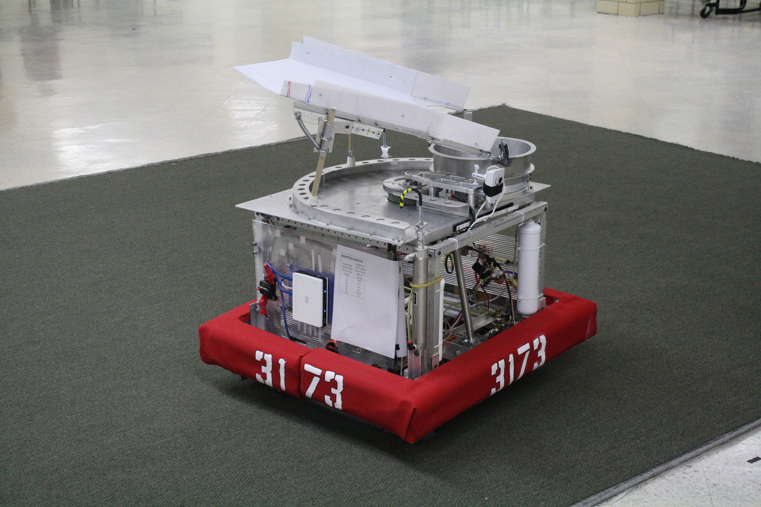 “Ultimate Ascent was the 2013 FIRST Robotics Competition game. It is styled similarly to disc golf… Drivers control their robots, attempting to score discs into the goals at the opposite end of the playing field. The robots also can climb their alliance's pyramid at the end of the match to score additional points. In the final thirty seconds the human players can throw their six colored discs into play over the alliance wall.”